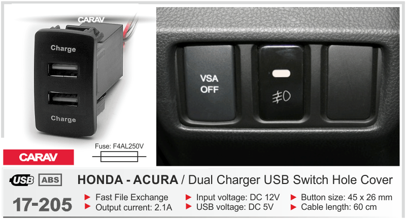USB РАЗЪЕМ НА HONDA 2 ПОРТА 2 ЗУ 17-205