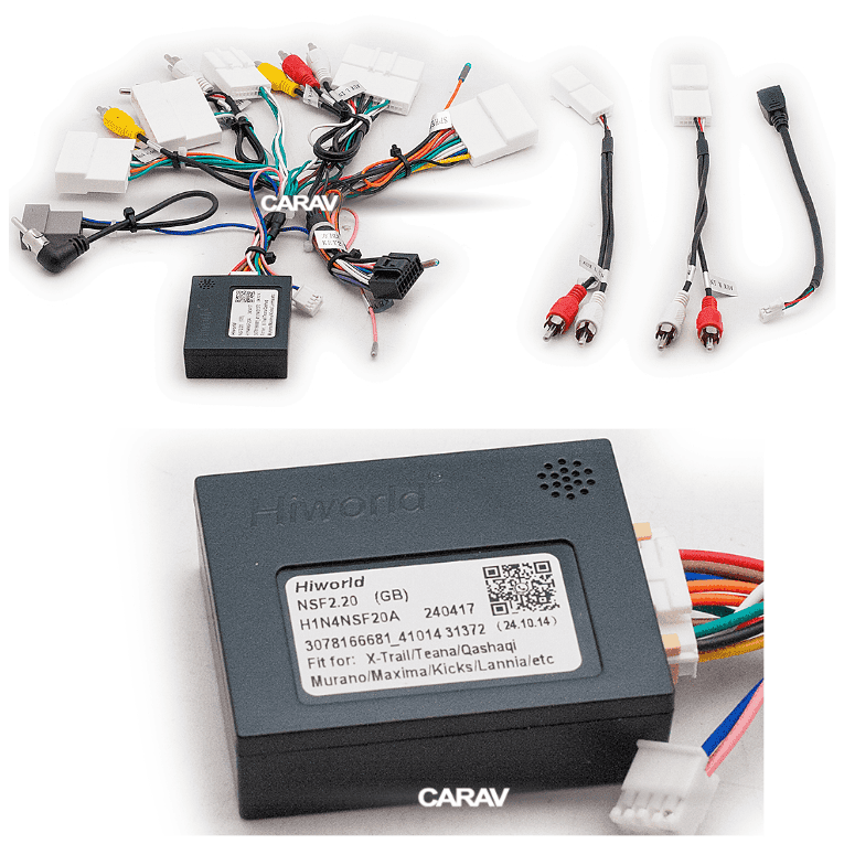 Переходник на NISSAN Altima 2013+; Murano 2015+; Qashkai 2011+/2016+; Rogue 2014+; Teana 2013-2020; Tiida 2016+; X-Trail 2013-2018; Terra 2018+ / Power + Speakers + Antenna + Wheel + Camera + USB + RCA + CANBUS CARAV 16-297